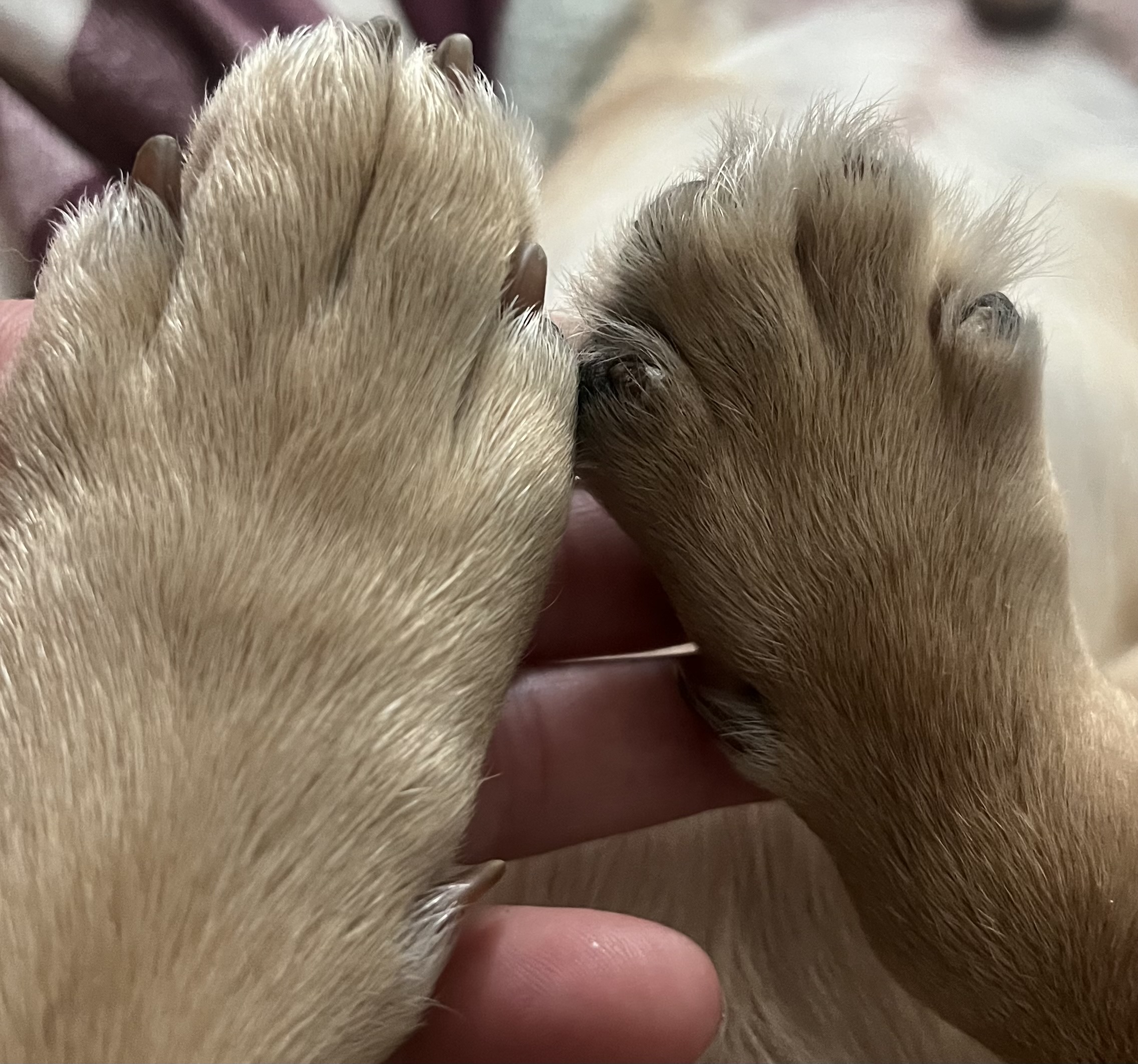 Image description: two front paws of a labradoodle puppy. The left is the expected size for a 5 month old puppy but the right paw is significantly smaller